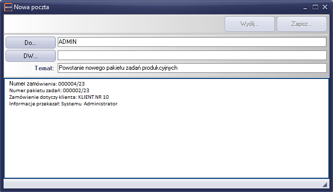 Rysunek 133 Informacja o utworzeniu nowego pakietu zadań produkcyjnych