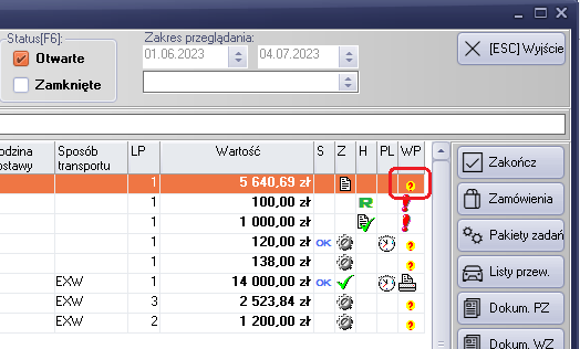 Rysunek 134 Nowa ikona informująca o braku wszystkich potwierdzeń wykonania produkcji i zamówienia towarów handlowych. Brak możliwości wydrukowania potwierdzenia do klienta