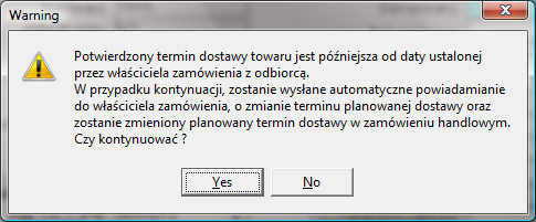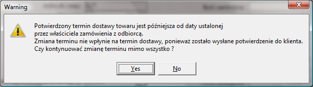 Jeśli natomiast potwierdzony termin zakończenia produkcji [D3] powiększony o lead time przekracza aktualny termin dostawy, na ekranie pojawi się okno z ostrzeżeniem oraz wyborem kontynuacji zmiany terminu dostawy.