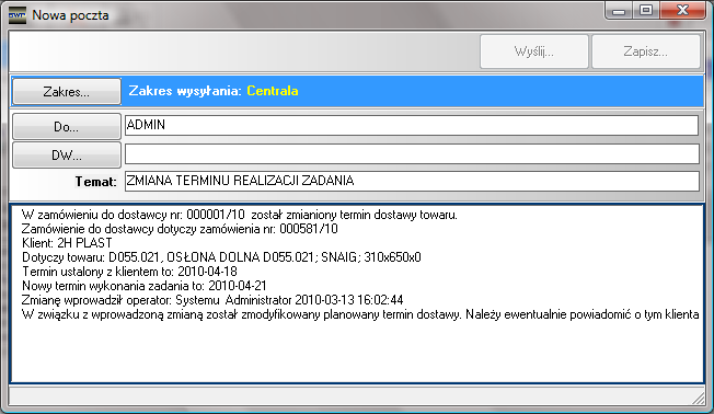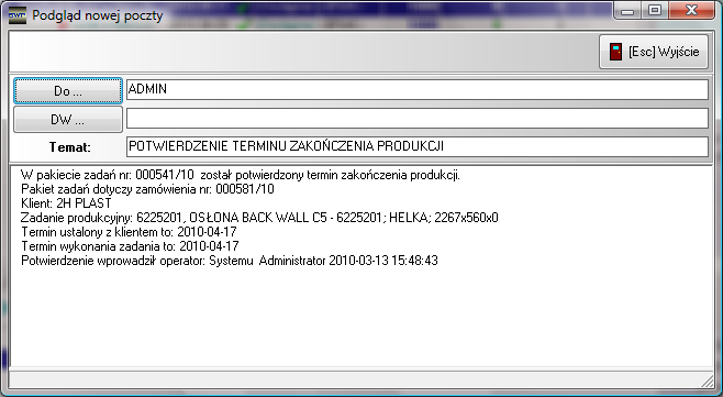 Rysunek 142 Informacja do właściciela zamówienia handlowego o dokonanej zmianie planowanego terminu dostawy wynikającego ze zmiany terminu zakończenia produkcji