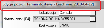 Wprowadzenie daty do pola "Potwierdzona data dostawy", podczas zatwierdzania zmian klawiszem "OK", jest porównywana z aktualnym planowanym terminem dostawy pomniejszonym o wskaźnik Lead Time. Aktualna data widoczna jest w nagłówku formularz edycji pozycji zamówienia do dostawcy.