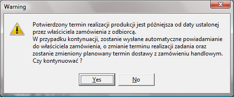Jeśli wprowadzony termin zakończenia produkcji powiększony o lead time nie przekracza aktualnego terminu dostawy w zamówieniu handlowym, zostanie jedynie wygenerowana informacja do właściciela zamówienia handlowego o dokonaniu potwierdzenia.
