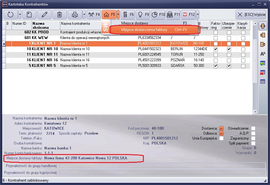 W celu wprowadzenia informacji dotyczącej miejsca dostarczenia faktury, należy zdefiniować odpowiednie dane w kartotece klienta. W tym celu po otwarciu okna kartoteki klienta uruchamiamy opcję kombinacją klawiszy Ctrl+F5 lub w pasku narzędzi uruchamiamy pasek menu kontekstowego klawisza Miejsca Dostawy F5, wg wzoru poniżej.