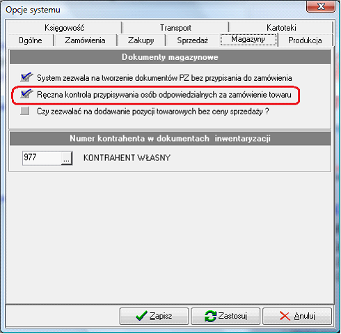System pozwala również na przypisanie osoby odpowiedzialnej za zakup towaru. Informacja ta wykorzystywana jest podczas tworzenia raporty magazynowego w module magazynów. Raport pozwala na analizę stanów magazynowych pogrupowanych wg. Osoby odpowiedzialnych za poszczególne zakupy. Osobę odpowiedzialna przypisujemy do dokumentu przy pomocy klawisza w polu „Osoba odpowiedzialna za zakup towaru”