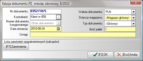 W formularzu podajemy standardowe informacje, dotyczących nazwy kontrahenta, numeru dokumentu, daty dokumentu czy dodatkowo uwagi. Ponadto, formularz zawiera pole dotyczące ilości wydanych palet. Bardzo istotną informacją, jest rodzaj waluty. W przypadku dostawców zaznaczonych w kartotece jako krajowi, system automatycznie narzuca walutę w złotych, bez możliwości zmiany. Jeśli natomiast w kartotece dostawca będzie oznaczony jako zagraniczny, wtedy system wprowadza standardową walutę zdefiniowaną w opcjach systemu. Walutę można zmienić na dowolną zdefiniowana w systemie. Dodatkowo, obok listy walut znajduje się przycisk umożliwiający przejście do okna zarządzania tabelą walut. Ustalenie waluty jest bardzo istotną czynnością, ponieważ od tej pory wszystkie operacje w dokumencie jak również przypisanie faktury walutowej, będzie definiowane w wybranej walucie.