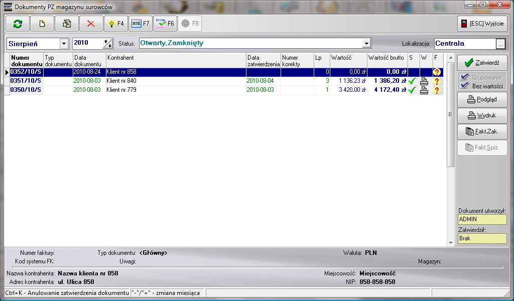 Lista nagłówków dokumentów, zawiera podstawowe informacje o dokumencie takich jak numer dokumentu, data dokumentu nazwa kontrahenta, czy wartości dokumentu. Dodatkowo trzy ostatnie kolumny zawierają następujące informacje: