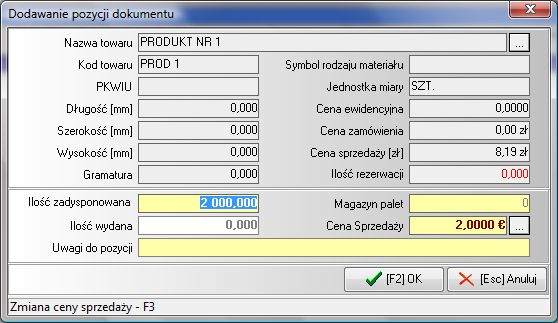 Po zaznaczeniu podświetleniem towar, który chcemy dodać do dokumentu, towar wprowadzamy poprzez potwierdzenie klawiszem „Enter”. Następnie pojawi się formularz edycji pozycji dokumentu.