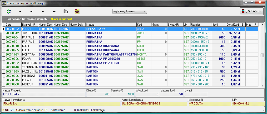 Po liście poruszamy się klawiszami nawigacji (strałki góra,dół), lub wpisując fragment nazwy towaru, możemy towar wyszukać, zgodnie z zasadami szukania opisanymi na początku instrukcji.