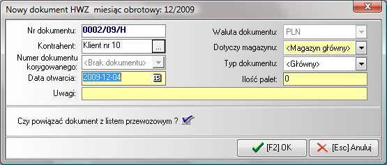 W formularzu podajemy standardowe informacje dotyczących nazwy kontrahenta, daty dokumentu czy uwag. Numer dokumentu nadawany jest automatycznie przez system. Zarządzanie numeracją dokumentów, opisane zostało w rozdziale „Zarządzanie systemem”. Dodatkowo formularz zawiera pole dotyczące ilości wydanych palet. Bardzo istotną informacją jest rodzaj waluty. W przypadku odbiorców zaznaczonych w kartotece jako krajowy, system automatycznie nadaje walutę w złotych, bez możliwości zmiany. Jeśli natomiast w kartotece odbiorca będzie oznaczony jako zagraniczny, wtedy system wprowadza standardową walutę zdefiniowaną w opcjach systemu. Walutę można zmienić na dowolną zdefiniowana w systemie. Dodatkowo, obok listy walut znajduje się przycisk umożliwiający przejście do okna zarządzania tabelą walut. Ustalenie waluty jest bardzo istotną czynnością, ponieważ od tej pory wszystkie operacje w dokumencie, jak również przypisanie faktury walutowej będzie definiowane wg wybranej waluty. Po zatwierdzeniu nagłówka dokumentu, przechodzimy do definicji pozycji dokumentu.