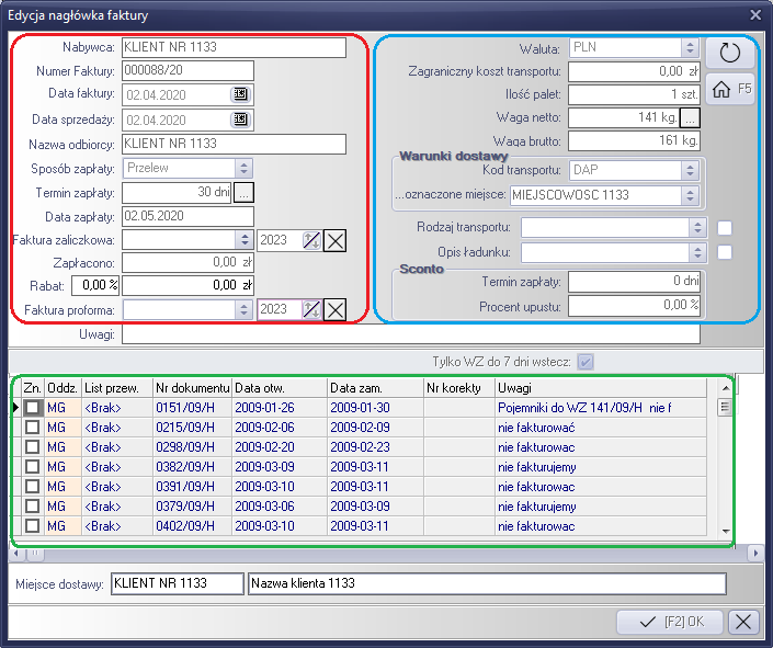 Po wybraniu odbiorcy pojawia się formularz faktury. Formularz podzielony jest na trzy części. Strefa czerwona służy do określenie podstawowych parametrów faktury, takich jak nabywca, płatnik, daty sprzedaży, daty wystawienia faktury, termin zapłaty itp. W strefie zielonej przedstawiona jest lista dokumentów "WZ" (Dokumenty magazynowe wydania na zewnątrz). Aby dokument WZ był widoczny na liście musi spełnić on kilka warunków. Po pierwsze musi być zatwierdzony przez dział handlowy, musi należeć do wybranego odbiorcy, dokument WZ musi być wystawiony e odpowiedniej walucie. W oknie możemy również przeglądać dokumenty magazynowe z innych lokalizacji (jeśli system pracuje w trybie z wieloma oddziałami). W celu przeglądu dokumentów z innych oddziałów należy włączyć opcję "Pokaż oddziały". W celu przypisania dokumentów WZ do tworzonej faktury, należy zaznaczyć opcję "Zn.". Warunkiem przypisania wielu dokumentów WZ do jednej faktury, jest takie same miejsce dostawy. W innym przypadku system poinformuje o braku możliwości przypisania dokumentów WZ z wielu miejsc dostawy. Dokumenty zaznaczamy przy pomocy myszy, lub naciskając klawisz "spacja".
