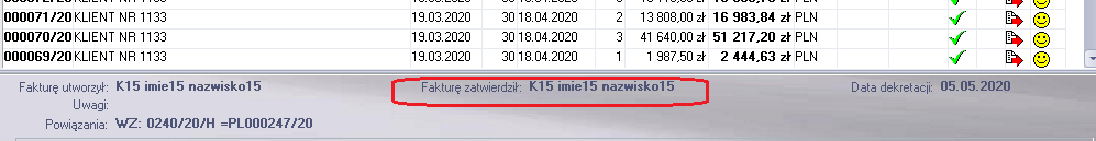 Zatwierdzoną fakturę, można odznaczyć przy pomocy kombinacji klawiszy „Ctrl+K”. Jednak odznaczenia, może dokonać jedynie osoba, która zatwierdzała dokument. Informacja o osobie zatwierdzającej znajduje się w panelu funkcji dodatkowych.