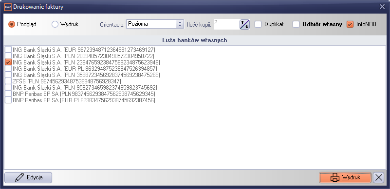 Panel pozwala wybrać rodzaj wydruku na ekran bądź na drukarkę, ilość kopii oraz bank własny, który zostanie umieszczony na fakturze.