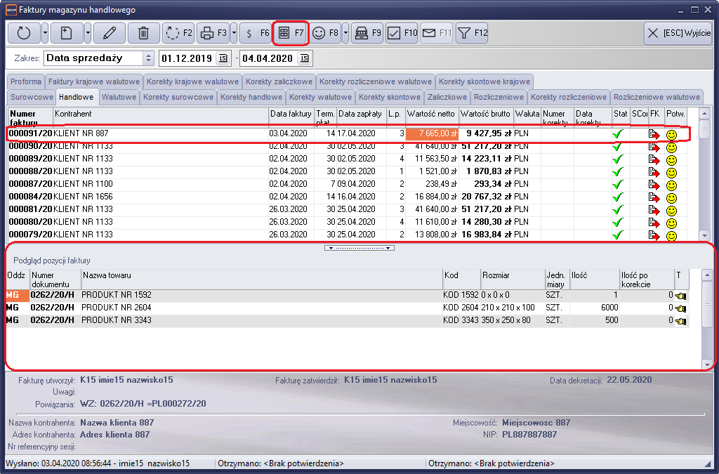 Klawisz [F7] umożliwia podgląd pozycji dokumentu z poziomu okna nagłówków dokumentu. Po uruchomieniu opcji okna przeglądu zostanie podzielone na dwie części. W górnej przeglądamy nagłówki dokumentów, w dolnej zaś przeglądamy pozycje wskazanego nagłówka dokumentu.