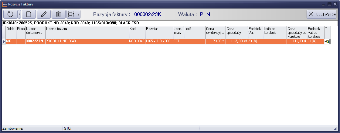 W oknie pozycji korekty faktury, można wykonać edycję poszczególnych pozycji, jak również dodać nowe pozycje, których nie ma w fakturze źródłowej.