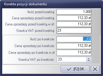 W formularzu mamy możliwość zmiany ilości oraz ceny sprzedaży w polach „ilość po korekcie” i „cena sprzedaży”. Po dokonaniu niezbędnych zmian zatwierdzamy dokument i drukujemy.