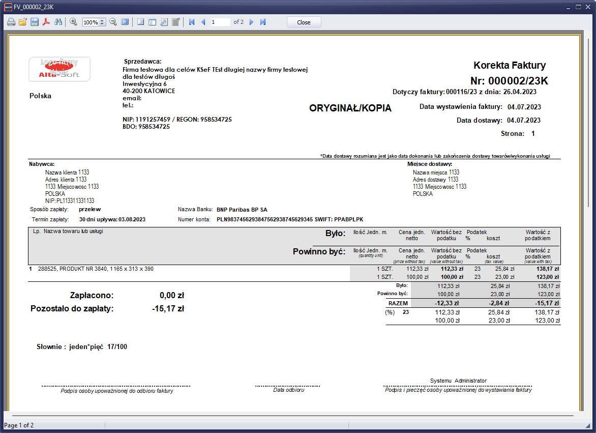 Rysunek 236 Przykładowy wydruk korekty faktury sprzedaży