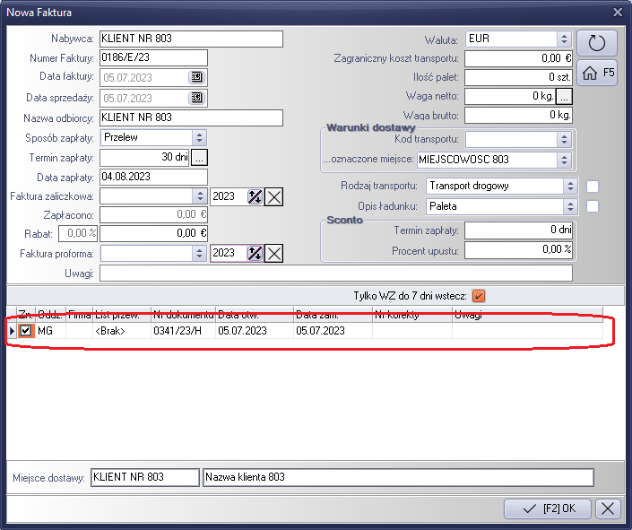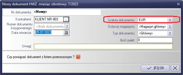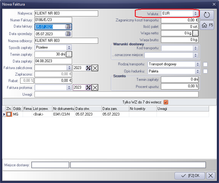 Ustawiamy odpowiednią walutę. Na podstawie wybranej waluty zostaną przedstawione dokumenty WZ, utworzone dla wybranego klienta i dla odpowiedniej waluty.