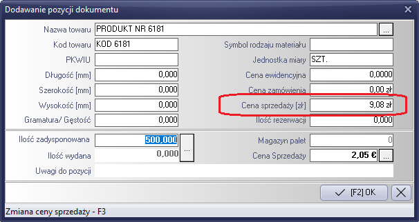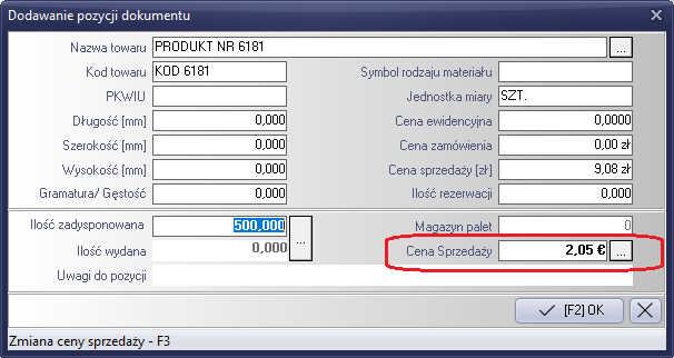 UWAGA : W przypadku edycji pozycji towarowej w dokumencie, cena sprzedaży w złotych, zawsze przeliczana jest wg kursu obowiązującego w dniu tworzenia dokumentu minus ilość dni ustalonych w opcjach programu, niezależnie od aktualnego kursu. Przeliczenie ceny sprzedaży wymaga wejścia do pola „Cena sprzedaży” i potwierdzenia klawiszem „Enter”.