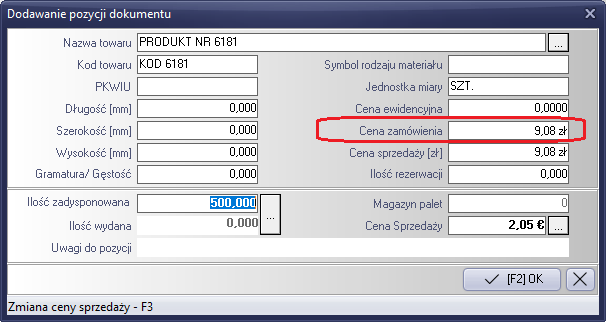 Jeśli towar ma określoną cenę zamówienia, cena ta jest przeliczana ze złotych na wartość walutową zgodnie a obowiązującym kursem walutowym i widoczna jest w polu „Cena zam.”