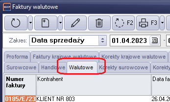 Faktury walutowe magazynu surowców i magazynu handlowego mają wspólną numerację i jest ona niezależna od numerów faktur krajowych np.. ”000/E/06”.