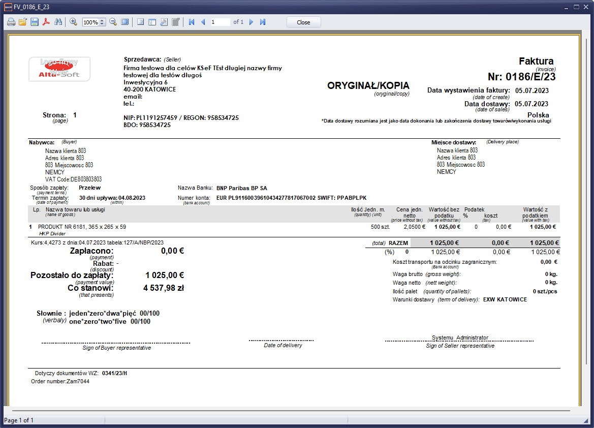 Rysunek 245 Przykładowy wydruk faktury walutowej