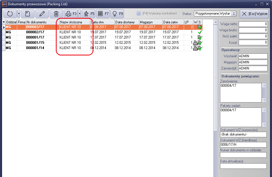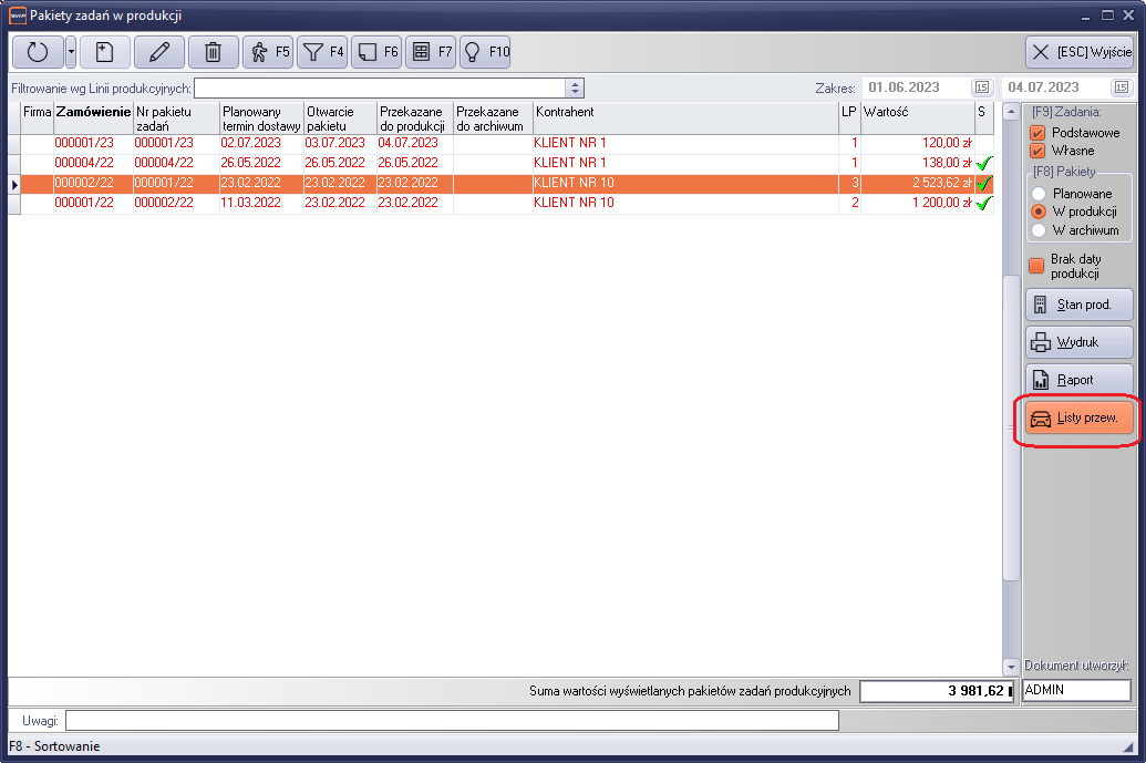 Jeśli moduł uruchomimy z tego miejsca, w oknie automatycznie będziemy widzieli listy przewozowe kontrahenta, dotyczące wskazanego zamówienia produkcyjnego.