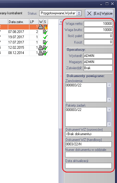 W prawej części okna umieszczony został panel informacyjny, zawierający informacje o statusie dokumentu przewozowego.