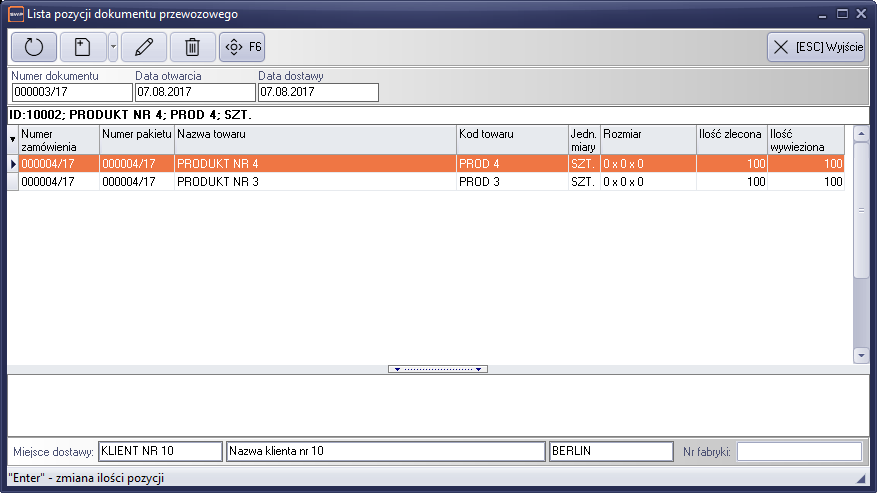Każda pozycja dokumentu, posiada zdefiniowane dwie ilości. Pierwsza, „ilość zlecona” jest to ilość, która została wprowadzona do dokumentu podczas definicji. Ilość ta jest niezmienna. Druga ilość, to początkowo „ilość zarezerwowana”. Ilość ta w fazie tworzenia i realizacji, jest równa ilości zleconej. Jednak po przypisaniu dokumentu WZ i zatwierdzeniu dokumentu przewozowego, ilość ta jest ponownie wyliczana, na podstawie dokumentu WZ i stanowi „ilość wywiezioną”.
