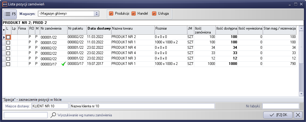 Lista ta, jest różna w zależności od trybu uruchomienia modułu. Jeśli moduł był uruchomiony z głównego menu programu, to w liście znajdą się wszystkie pozycje zamówień produkcyjnych danego klienta. Jeśli moduł uruchomiono z okna zamówień, w liście będą znajdowały się tylko pozycje z danego zamówienia produkcyjnego. W liście znajdują się tylko pozycje z zamówień produkcyjnych w fazie produkcji.