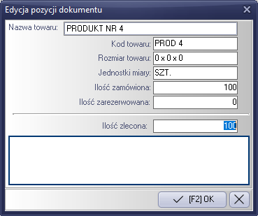Następnym krokiem będzie określenie ilości wybranych pozycji. W tym celu w oknie pozycji dokumentu podświetlamy pozycję w której zamierzamy zmienić ilości i naciskamy klawisz "Enter" lub kombinację "Ctrl+E". Efektem będzie pojawienie się okna edycji wskazanej pozycji. W oknie można zmienić ilości zlecane oraz możemy umieścić uwagi dotyczące danej pozycji.