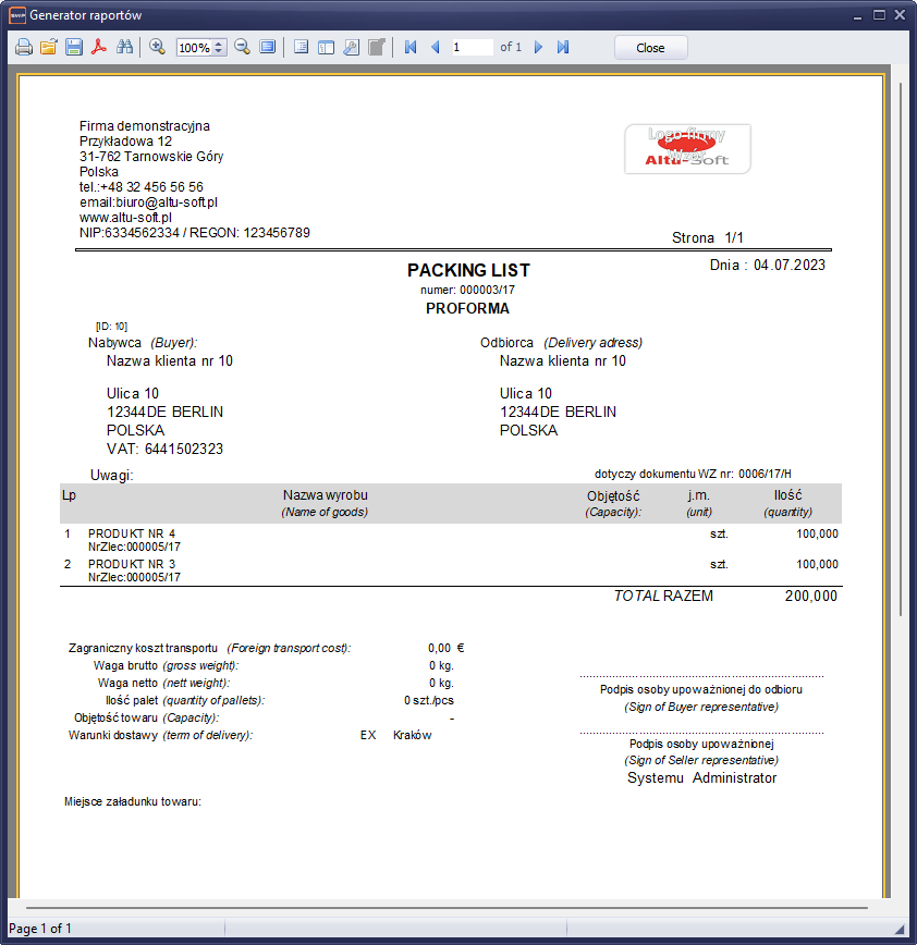 Wydruk dokumentu, można wykonać w dowolnym momencie realizacji dokumentu przewozowego. Jednak dopóki list przewozowy nie będzie zatwierdzony, dokument będzie oznaczony jako „Proforma” . Jeśli dokument będzie posiadał status realizowanego, wydruk dokumentu będzie oznaczony klauzulą „Oryginał/Kopia”.