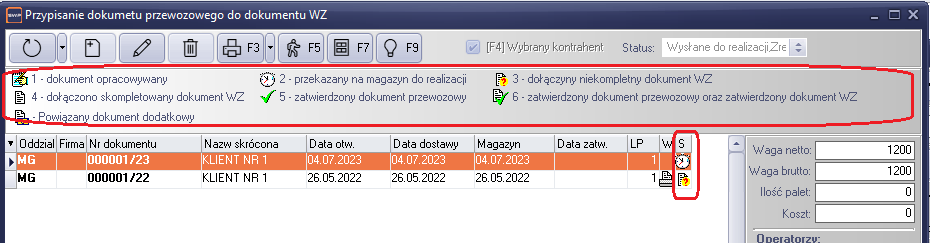 Okno nagłówków dokumentów przewozowych, zawiera szczegółowe informacje stanu realizacji. W kolumnie „S”(Status), system wyświetla 6 stanów realizacji listu przewozowego (Informacje te można uzyskać pod klawiszem F9):