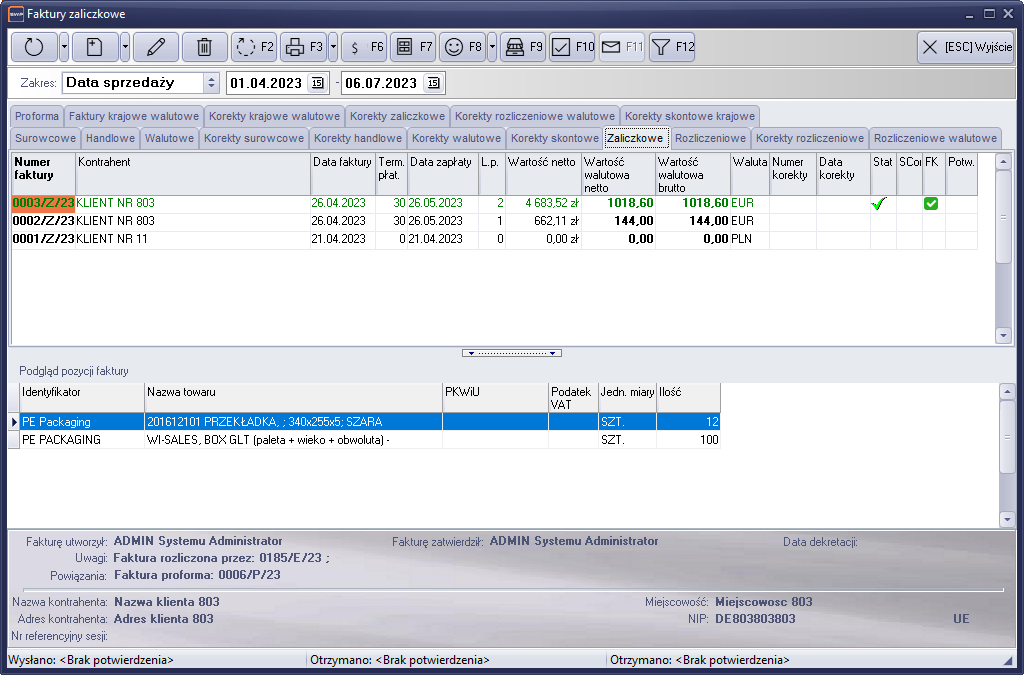 Rysunek 274 Widok w oknie faktur zaliczkowych