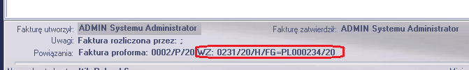Wprowadzenie znacznika spowoduje uaktywnienie listy rozwijanej "Powiązane dokumenty WZ". W końcowym procesie rozliczania faktury, gdy już będzie wystawiony dokument WZ, przy pomocy tej listy będzie możliwe powiązanie dokumentu WZ z fakturą. W tym miejscu warto nadmienić, że jeśli w procesie tworzenia faktury zostanie wprowadzony numer faktury proforma w oknie "Faktura proforma", system automatycznie uzupełni pozycje faktury zaliczkowej na podstawie faktury proforma. Po zatwierdzeniu formularza edycji nagłówka faktury, pozostaje uzupełnić pozycje faktury jeśli uprzednio nie została ona powiązana z fakturą proforma.