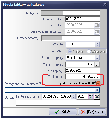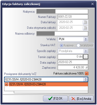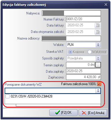 Powiązanie faktury zaliczkowej z dokumentem WZ