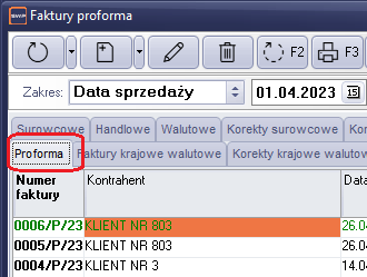 Faktury proforma dostępna są, z poziomu okna obsługi faktur sprzedaży. W celu przeglądu faktur zaznaczamy odpowiedni typ faktury.