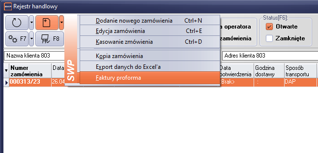 Rysunek 247 Faktury proforma dostępne są również z poziomu rejestru zamówień