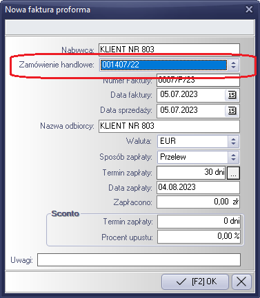 Następnym krokiem będzie wybranie zamówienia na podstawie którego utworzona będzie faktura proforma. W liście dostępne są wszystkie otwarte zamówienia wybranego kontrahenta. Po wypełnieniu pozostałych pół w formularzu, zatwierdzamy formularz klawiszem "OK [F2]". Pozycje faktury tworzone są na podstawie wybranego zamówienia. System rozpoznaje czy dla danego zamówienia była już wystawiana inna faktura proforma. Pozycje wstawiane są do dokumentu z ilościami po odjęciu pozycji z innych faktur.