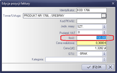 W oknie pozycji faktury, istnieje możliwość wykasowania niepotrzebnych pozycji, lub edycji pozycji. Formularz edycji pozwala na zmianę ilości danego towaru. "Ctrl+E"
