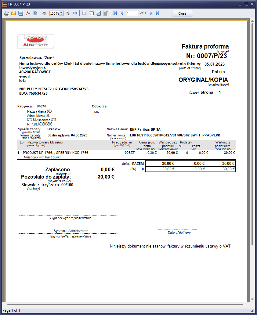 Rysunek 252 Przykładowy wydruk faktury proforma