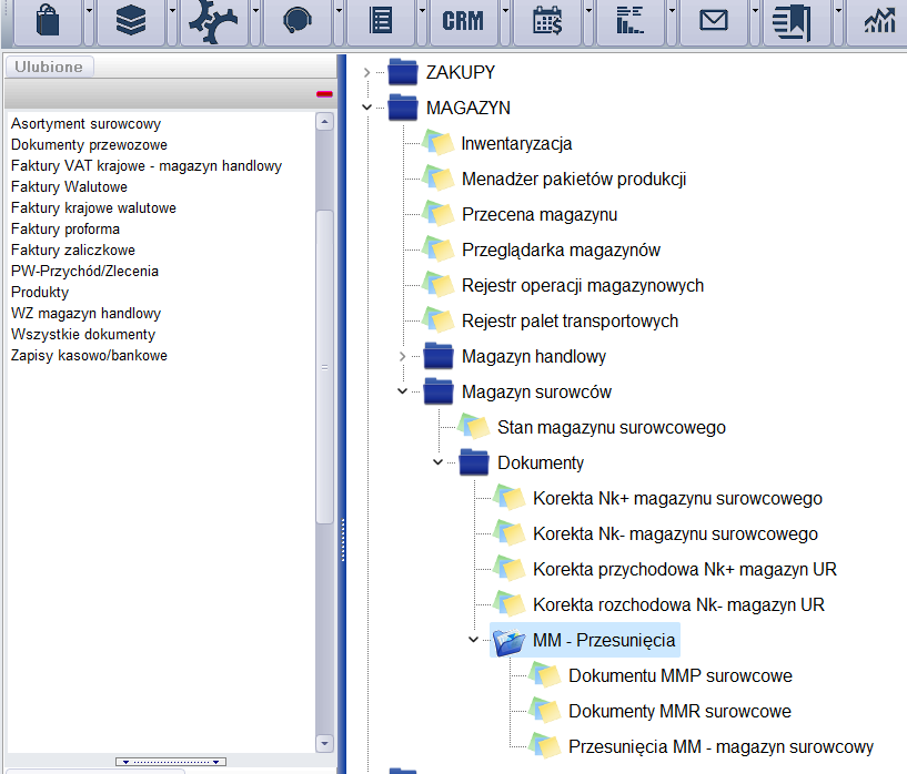 Dokumenty „MMP” i „MMR”, stanowią grupę dokumentów technicznych, stosowanych podczas przydzielania towaru surowcowego do zlecenia. Dokument „MMP”, jest dokumentem przesunięcia towaru z magazynu surowcowego, do magazynu produkcyjnego. Dokument „MMR” stanowi dokument przychodowy na Magazyn surowcowy, gdzie przy pomocy tego dokumentu następują zwroty odpadów użytkowych, tworzonych w procesie produkcji. Szerzej temat ten został opisany w rozdziale „Produkcja”. W Funkcjach magazynu, istnieje jedynie możliwość przeglądania tych dokumentów. Dokumenty znajdują się w menu głównym „Magazyn- >Magazyn surowców-> dokumentu-> MM przesunięcia”.