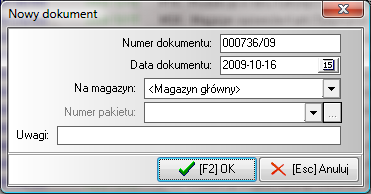 Jeśli wybierzemy pod-magazyn obsługujący pakiet PKT (opcja magazynu "Łączenie dokumentów w pakiety PKT"), wtedy system umożliwi nam wybór istniejącego pakietu PKT lub utworzenie nowego, przy pomocy klawisza z prawej strony pola "Numer pakietu:"