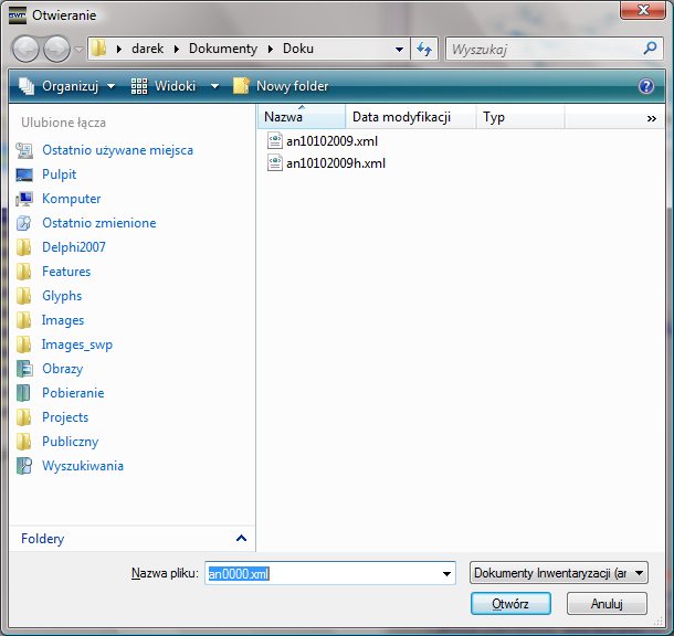 Jeśli program uruchamiamy nie po raz pierwszy i poprzednio utworzyliśmy plik arkusza inwentaryzacji to wybieramy opcję „Pliki” i następnie „Otwórz dokument”. Po wykonaniu operacji, program pozwoli na wybranie pliku dokumentu. Warunkiem znalezienia pliku jest odpowiedni format nazwy pliku, opisany powyżej.