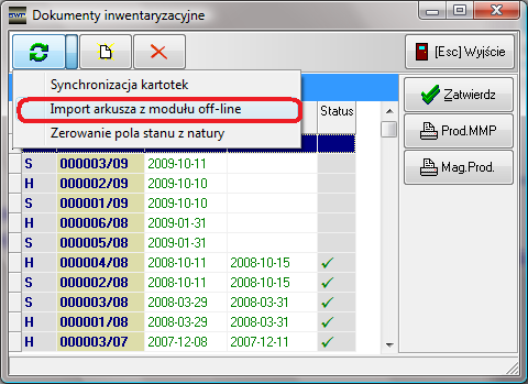 Import arkusz przeprowadzamy z poziomu okna nagłówków dokumentów inwentaryzacji.