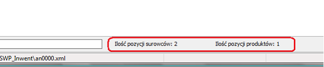 Dodatkowo w panelu u dołu okna, umieszczona został a informacja o aktualnym stanie ilościowym pozycji w arkuszu. Informacja podzielona została na magazyn surowcowy i produktów.