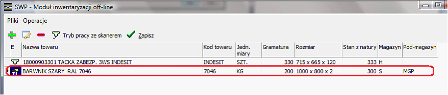 Moduł przeznaczony jest do obsługi inwentaryzacji magazynu zarówno magazynu surowcowego jak i handlowego w trybie off-line. Moduł umożliwia rejestracje towaru w magazynie z natury, bez podłączenia do systemu SWP. Jednak rejestracja odbywa się na bazie kartoteki towarowej systemu, jak i zleceń produkcyjnych systemu SWP. Rejestracja w towaru może być realizowana przy pomocy skanera kodów kreskowych, na podstawie etykiet towarowych lub etykiet towaru gotowego w przypadku magazynu handlowego.