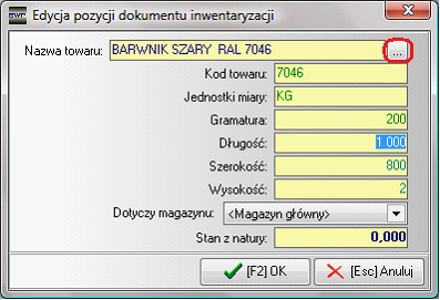 Formularz pozwala na zdefiniowanie takich parametrów jak: Gramatura, rozmiar, pod-magazyn oraz stan z natury. Po zatwierdzeniu pozycja będzie widoczna w arkuszu.
