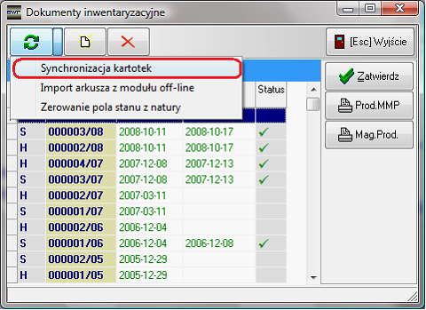 Synchronizację kartotek przeprowadzamy z poziomu systemu SWP. W module inwentaryzacji w menu kontekstowym klawisza odświeżania danych, wybieramy opcję „Synchronizacja kartotek”.