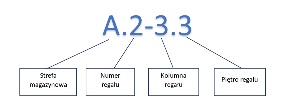 Kod lokalizacji składa się z czterech sekcji. Strefy magazynowa, numer regału, kolumna regału i piętro regału. Przykładowy kod lokalizacji podany poniżej: