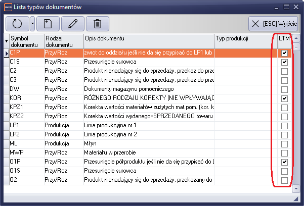 W oknie listy typów dokumentów należy określić, które z typów dokumentów będą obsługiwane przez mechanizm LTM. Aby dla dokumentu przychodowego były generowane kody lokalizacji, dokument musi dotyczyć magazynu obsługiwanego przez LTM oraz typ dokumentu musi mieć ustawiony znacznik obsługi LTM. W przeciwnym razie system będzie ignorował dany dokument.